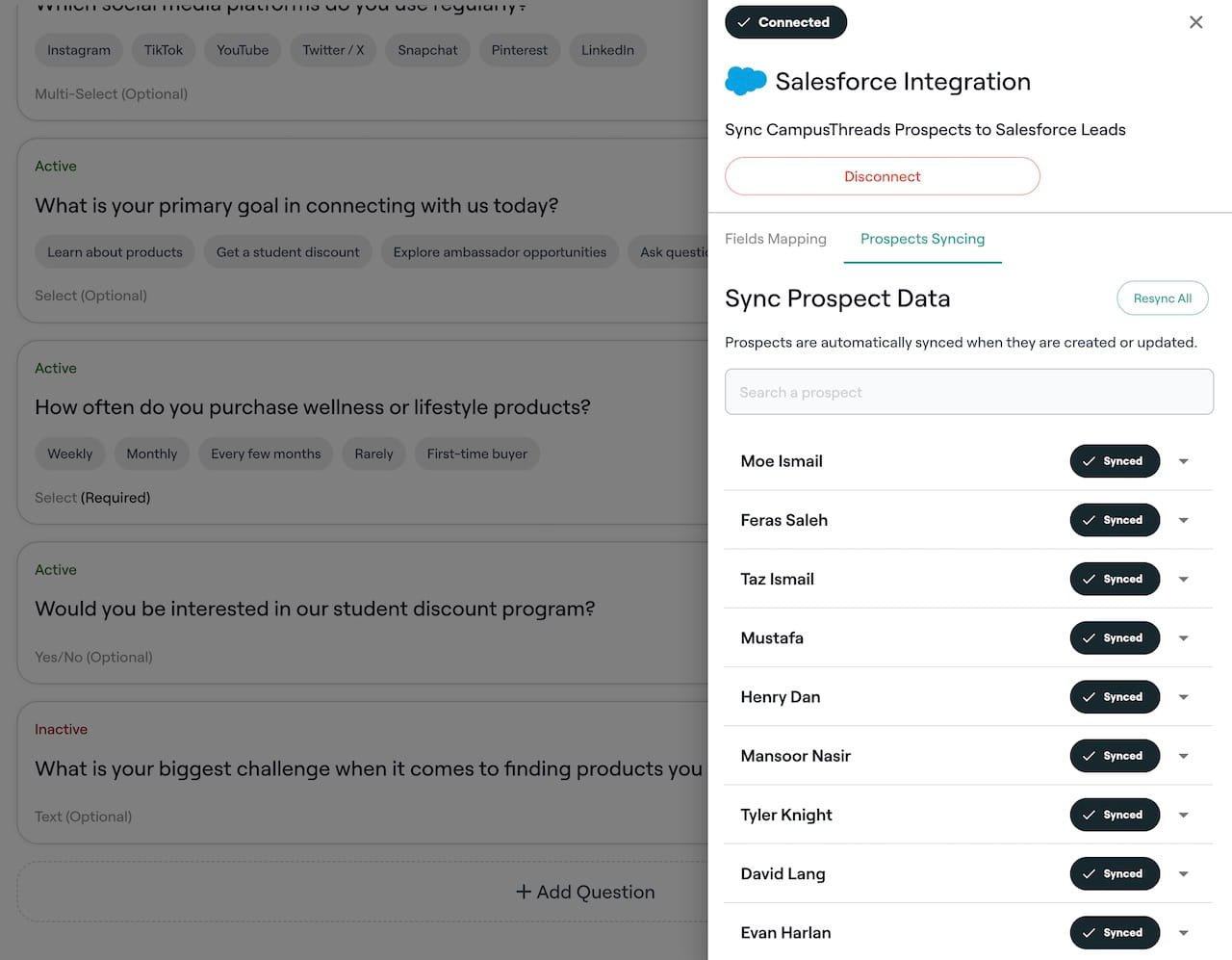 CampusThreads seamlessly integrates with leading CRMs such as Salesforce, Slate, Zapier, and more. Automatically sync and export collected prospect data to your existing CRM, ensuring a smooth and centralized recruitment workflow. This integration helps you maintain a unified database, track each lead’s journey, and personalize follow-ups based on real-time interactions. Our support team is available to assist with any custom integration needs.