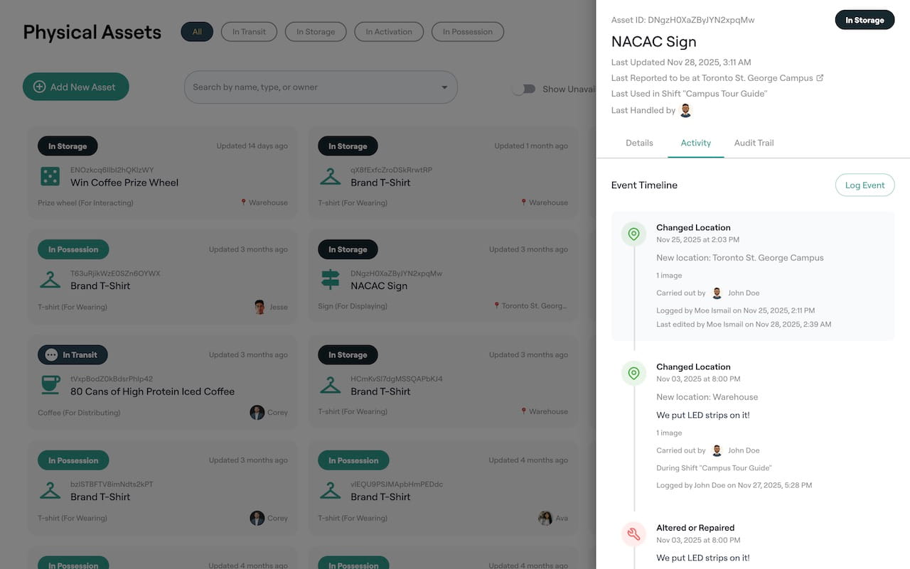 Know where every swag item, product, equipment, or display prop went and an event-based record of its usage and status.