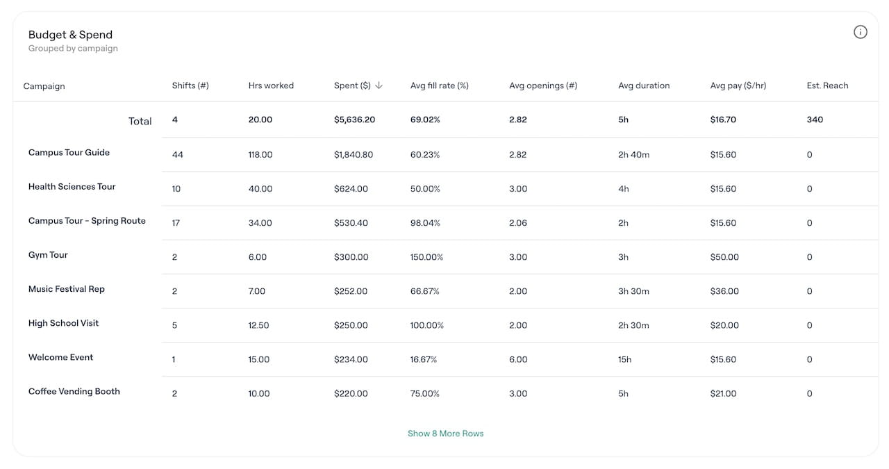 If you pay your student ambassadors, CampusThreads provides a complete budget tracking feature to help you manage program costs effectively. You can track ambassador compensation based on shifts while gaining insights into overall expenditures. This allows you to analyze costs, optimize your budget, and ensure your ambassador program remains financially sustainable.
