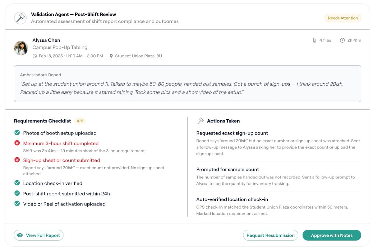 Validation Agent → Scours post-shift and task reports from ambassadors and assesses whether the requirements and intended outcomes were achieved and flags shortcomings or requests more details if not.