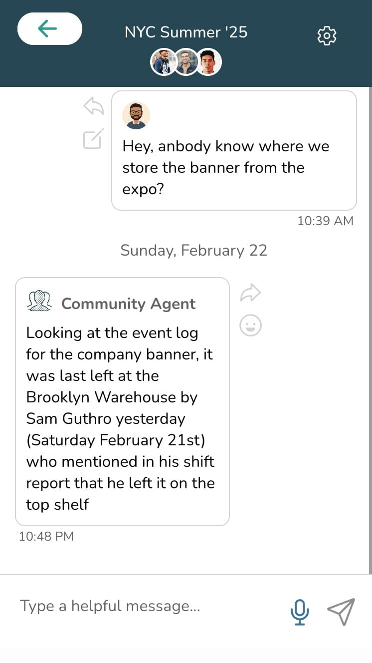 Community Agent → Scours your Discord, Slack, or CampusThreads messaging to proactively chime in and correct misunderstandings, answer questions, or flag potential issues to you