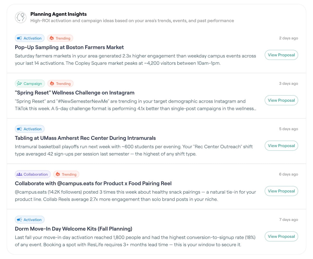 Planning Agent → Scours your local social media pages, event platforms, trends, and your campaign outcomes to come up with high-ROI ideas for future activations and campaigns that drive engagement forward