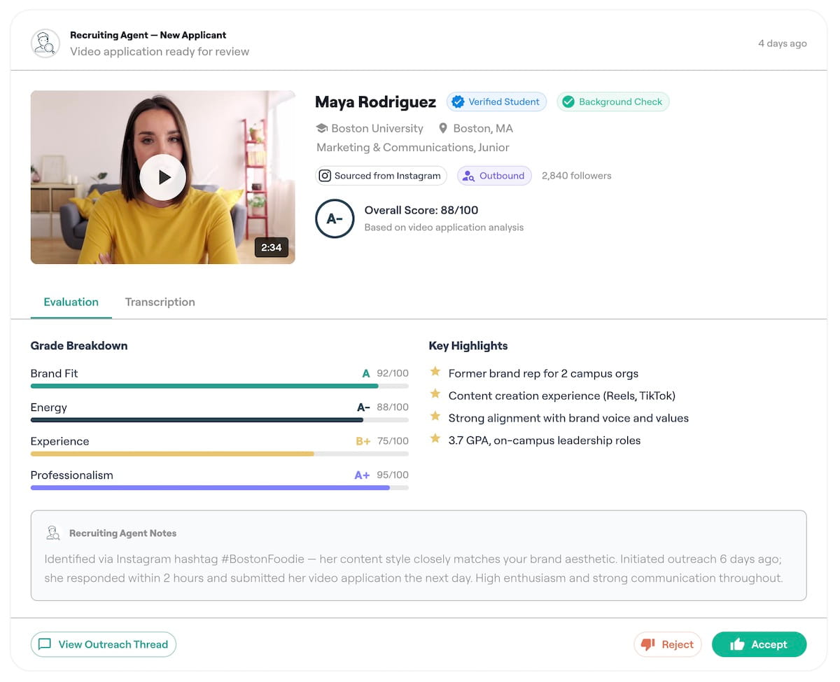 Recruiting Agent → Scours social networks to find, reach out to, and vet brand-aligned ambassadors to scale your programs